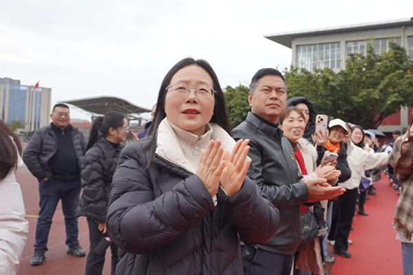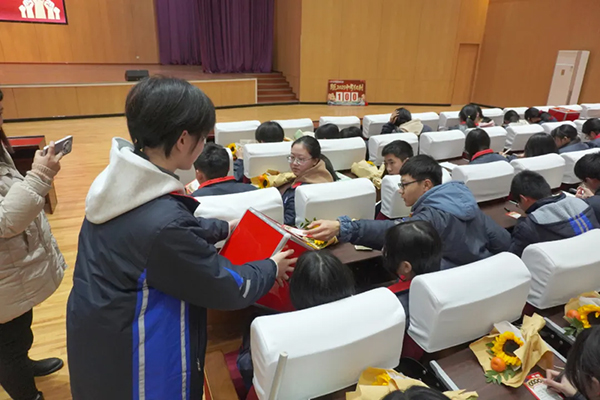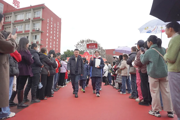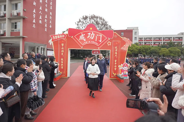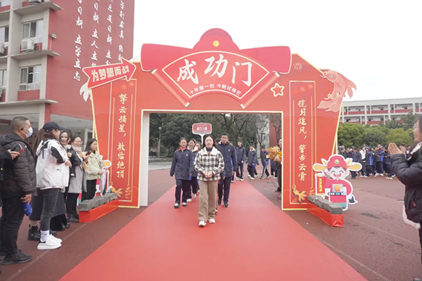 下午1:50分,九年级全体学子身着整齐校服,以昂扬之姿列队踏上红毯。校领导、教师团队与家长代表分列“魁星门”两侧,用击掌与呐喊为学子送上祝福。学子们目光坚定地穿过“魁星门”,在掌声中落座。这一刻,青春的热血与师长的期许交织成奋进的序章。