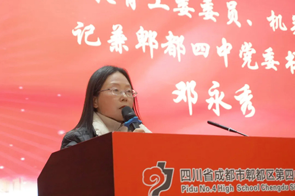 书记致辞·战略动员。郫都区教育工委委员、区教育局党组成员、机关党委书记兼郫都四中党委书记邓永秀以“奋斗百日,静心冲刺,决胜中考”为题发表讲话。邓书记援引全市15.4万考生竞争7万余高中学位的现实数据,强调竞争之激烈,并以往届“黑马”逆袭案例激励学子:“100天足以创造奇迹!”她提出四点备考策略:目标引领、科学规划、勇毅前行、心态制胜,号召学子以“战略上藐视困难,战术上重视细节”的姿态迎战中考。