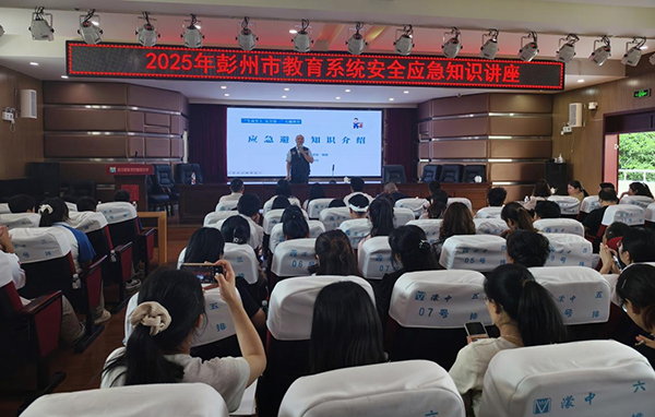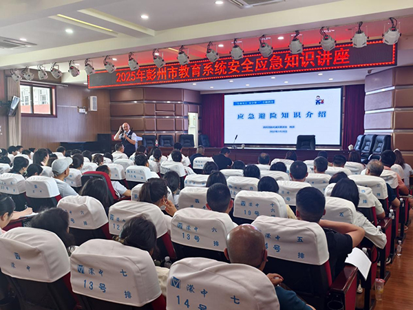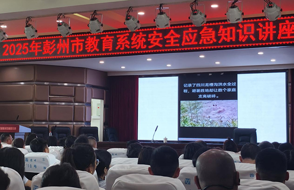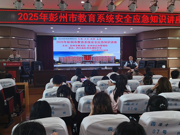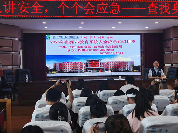 2025年5月28日,由彭州市教育局、彭州市应急管理局主办,四川省彭州市濛阳中学承办的“2025年彭州市教育系统五区片安全应急知识讲座”顺利开展,此次讲座由濛阳中学政教主任杨彬主持,四川省防灾减灾教育馆讲师杨波主讲,濛阳中学部分师生及彭州市五区片各幼儿园、中小学的安全管理干部参与了此次培训。