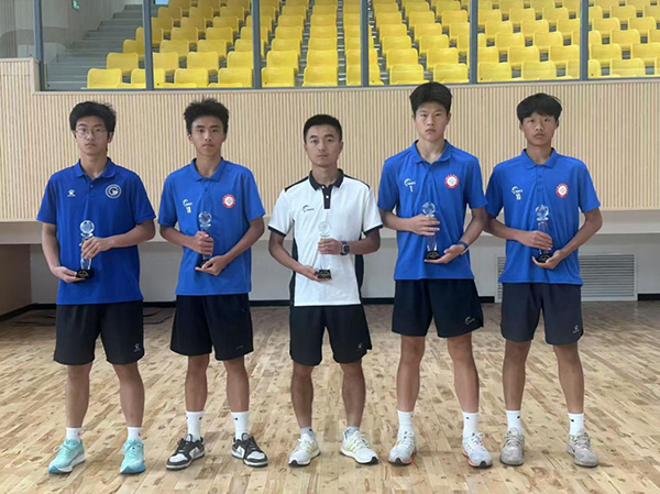 本次赛事中,华西中学队员凭借出色表现收获多项个人荣誉:从左至右:应文轩(U18最佳门将)、周成宜(U15最佳射手)、蒲玮彤(U15最佳教练)、白可成(U15最佳门将)、敬梓逸(U15最佳球员)。