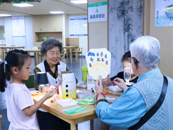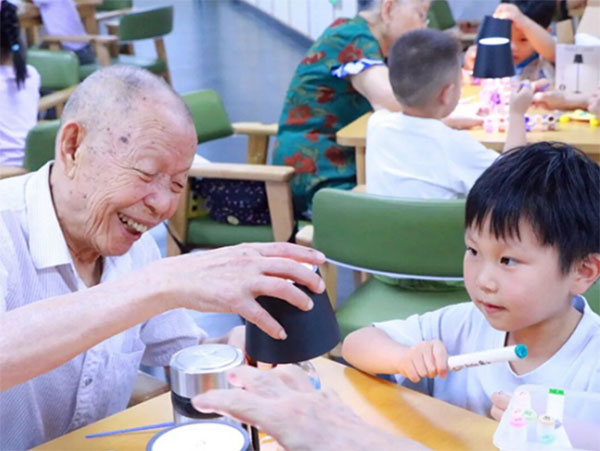 小手与布满皱纹的大手紧紧相握,一同摆弄材料、粘贴装饰。一盏盏小巧的手工灯在欢声笑语中渐渐成型,也将这份跨代的温情悄悄点亮。