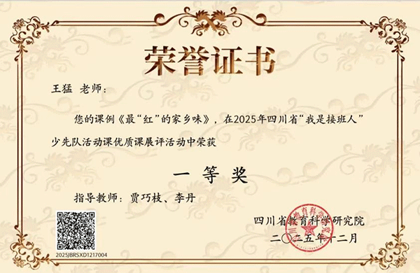 为深入学习贯彻习近平总书记关于少年儿童和少先队工作的重要论述,扎实推动少先队学科教研体系建设,促进少先队活动课程高质量发展,青羊区东城根街小学少先队大队辅导员王猛老师以赛促教,在成都市少先队活动课优质课赛课活动中历经层层选拔,最终脱颖而出,入围四川省决赛。在四川省教科院举行的“我是接班人”2025年少先队活动课“传承红色基因 凝聚强国力量”优质课赛课展评活动中荣获四川省一等奖!