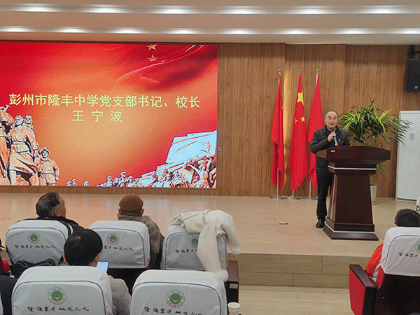 会议室里,嘉宾与师生代表全体起立,唱响国歌,激昂的旋律在会场内回荡,激发了大家的爱国热情。随后,彭州市隆丰中学党支部书记、校长王宁波致欢迎词,他向与会领导和嘉宾表示热烈的欢迎,并强调了此次活动的重要意义。他表示,学校将以此为契机,进一步深入开展大思政教育,培养德智体美劳全面发展的社会主义建设者和接班人。