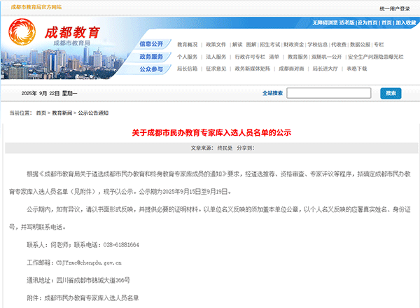 9月22日,马长俊校长成功入选成都市民办教育专家库(义务教育段),成为全市30名获此殊荣的教育工作者之一,彰显学校办学实力与教育品质。