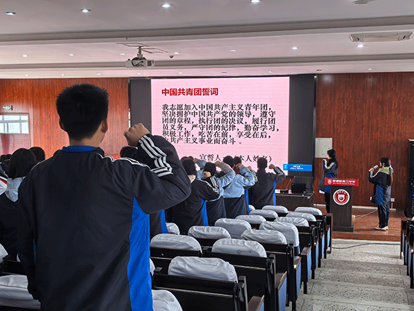 面向炽烈如火的团旗,新发展团员们右手握拳,在组织部部长李方源同学的领誓下,许下庄严承诺:“我志愿加入中国共产主义青年团……”誓言铮铮,回荡会场;初心灼灼,矢志不渝。这既是向组织的赤诚告白,更是向青春与时代发出的奋进强音。