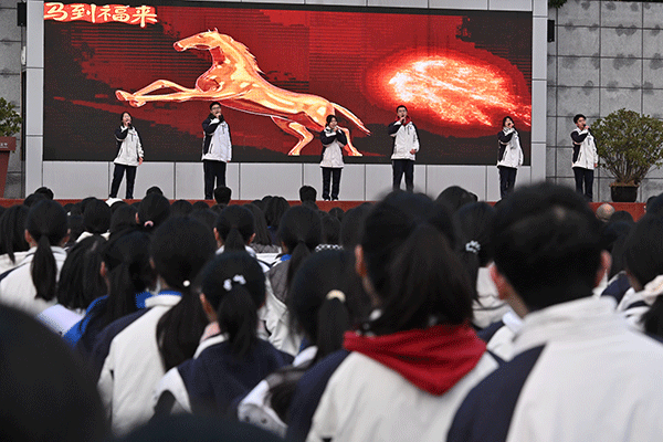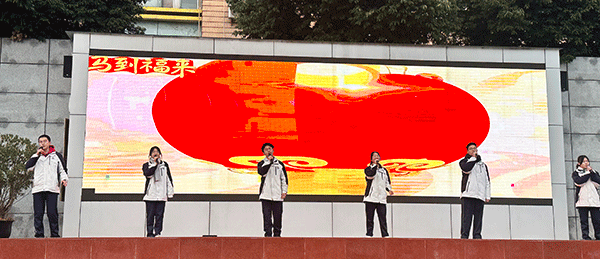 高二、高三学生代表杜鑫蕊、何思琦、凌永锋、周锐函、康宸珲、雷善琳共同献唱《三百六十五个祝福》。熟悉的旋律被赋予新意——三百六十五天,是三百六十五次向阳生长的可能。此刻,简单的祝福升华为对时光的郑重承诺,为崭新的年岁注入温暖的底色。