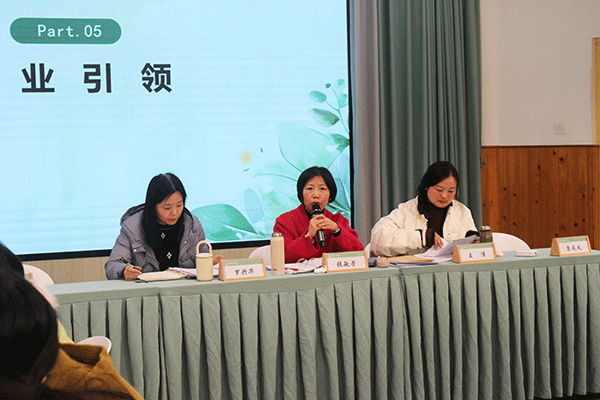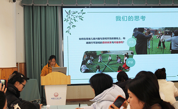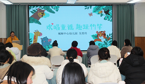 在专题交流环节,李艳老师以《大班幼儿跳竹竿游戏设计与教师支持》为题,结合园所一学期的实践探索,从游戏目标建构、内容设计与组织实施等方面,对大班跳竹竿游戏的整体推进情况进行了系统梳理与分享。随后,吴贵玲老师作了《“趣”玩竹竿,欢唱童谣》的案例分享,介绍了将童谣融入跳竹竿游戏、引导幼儿在不断尝试中提升节奏感与合作能力的实践过程。