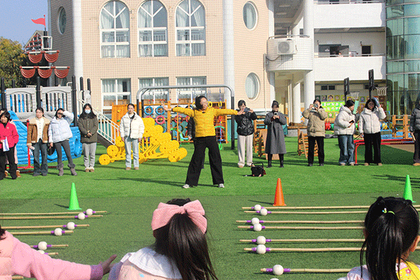在现场观摩环节,老师们观摩了钟琳老师执教的大班活动《我们设计的竹竿游戏》。活动中,幼儿以小组为单位自主设计玩法、布置场地,并在不断尝试中调整方案,展现了良好的合作意识与规则意识。
