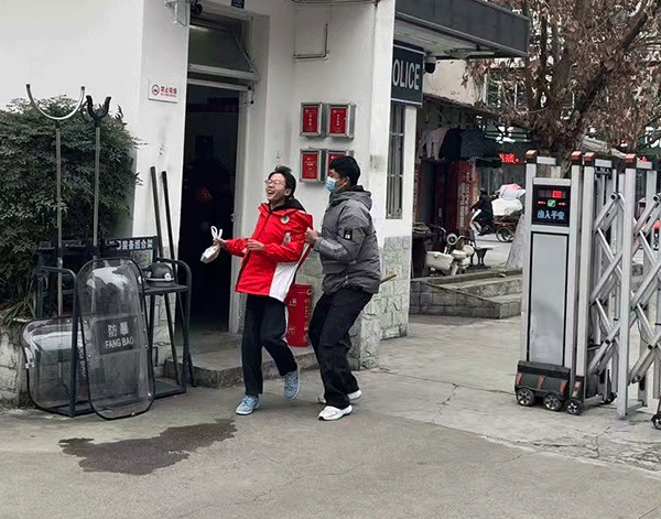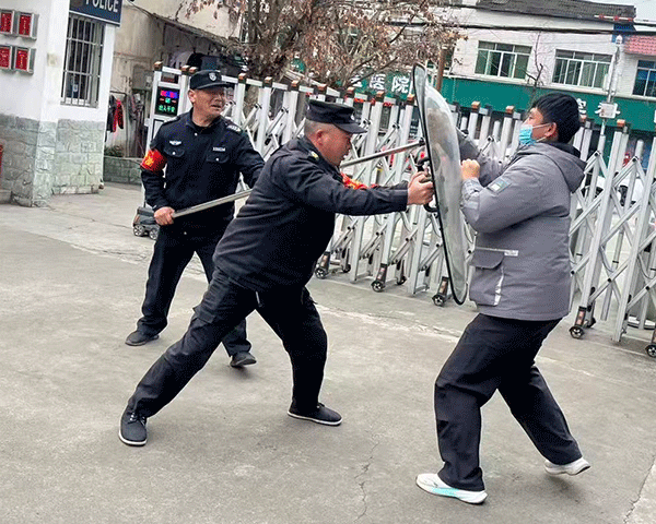 预警处置:演练当日,一名“暴恐分子”(由德育干事扮演)携带仿真器械在学校大门外尾随看病进校门的学生,试图突破门禁系统闯入校园伤害学生。门卫安保人员发现后立即上前制止并保护学生,另外安保人员迅速组成应急最小单元,并迅速使用防暴盾牌、钢叉等器材对“暴恐分子”进行拦截,形成防御阵型,为师生疏散争取时间。与此同时,还有一名安保队员立即启动一键报警装置,同步通过电话向学校行政报告。