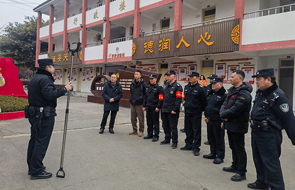 隆丰派出所民警现场对学校安全干部和安保人员进行点评和指导:器械使用、避险动作规范性,演示“一盾一叉”战术配合。